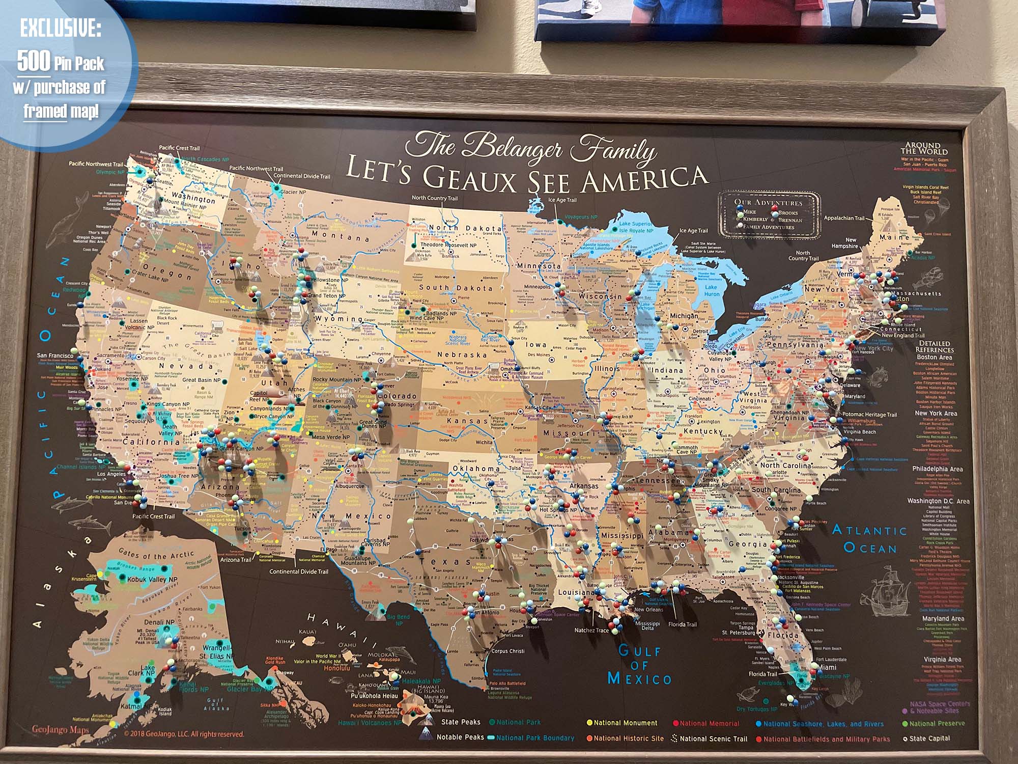 Framed USA Push Pin Map Charcoal Grey โ An Adventure Awaits LLC
